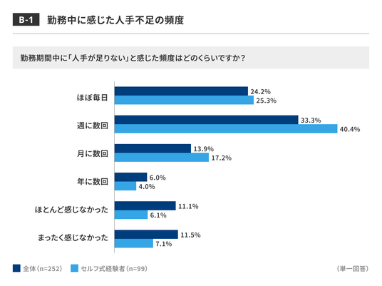 ガソリンスタンド従業員が勤務中に人手が足りないと感じた頻度は、「ほぼ毎日」「週に数回」が57.5%、セルフ式従業員に限ると65.7%にのぼりました。従業員全体の約6割、57.5%が慢性的に人手不足を感じています。