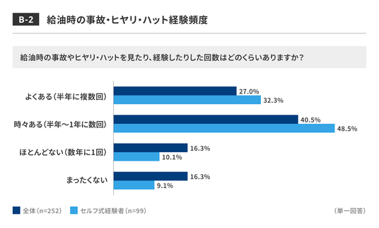 ・セルフ式ガソリンスタンド従業員の約3人に1人が「ヒヤリ・ハットがよくある(半年に複数回)」