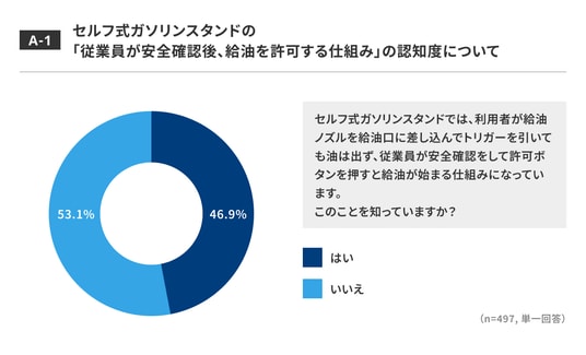 この仕組みを知っている人は、セルフ式ガソリンスタンド利用者の半分以下、46.9%にとどまりました。