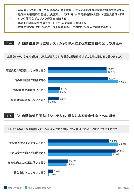 「AI自動給油監視システム」(AIがカメラやセンサーで給油者の行動を監視し、安全と判断すれば自動で給油を許可する仕組み)の導入による影響については、全体の8割以上が業務負担の軽減と安全性の向上を期待していました。特にセルフ式従業員では約9割、90.9%が業務負担の軽減を期待しており、安全性の向上を期待する人も86.9%でした。現場業務を支える「AI自動給油監視システム」への期待が高まっています。
