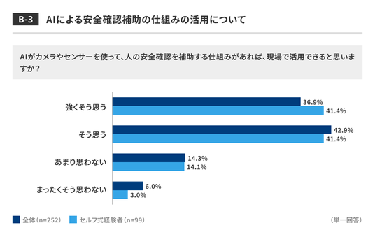 AIがカメラやセンサーを使って、従業員の安全確認を補助する仕組みについて「現場で活用できると思う」と回答した人は全体の約8割、79.8%でした。セルフ式従業員では82.8%とやや高く、AI活用に前向きな姿勢が見られました。