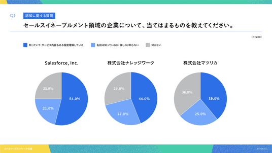 「Q1. セールスイネーブルメント領域の企業について、当てはまるものを教えてください。」(n=200)と質問したところ、「知っていて、サービス内容もある程度理解している」と回答した割合は、Salesforce, Inc.が54.0%、株式会社ナレッジワークが44.0%、株式会社マツリカが39.0%となりました。