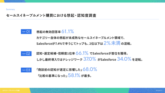 - 01|想起の無効回答率61.1%。カテゴリー自体の想起が未成熟なセールスイネーブルメント領域で、Salesforce(7.4%)が辛うじてトップも、2位以下は2%未満の混戦。