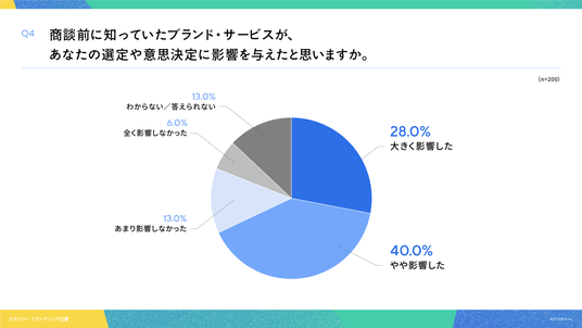 「Q4. 商談前に知っていたブランド・サービスが、あなたの選定や意思決定に影響を与えたと思いますか。」(n=200)と質問したところ、「大きく影響した」が28.0%、「やや影響した」が40.0%という回答となりました。