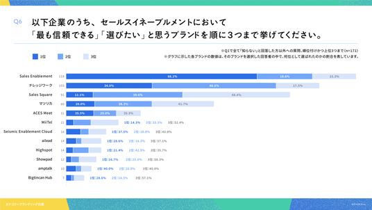 グラフに示した各ブランドの数値は、そのブランドを選択した回答者の中で、何位として選ばれたかの割合を表しています。例えば、Sales Enablementの「1位:66.1%」という結果は、Sales Enablementを選んだ回答者のうち66.1%が同ブランドを1位として挙げたことを意味します。