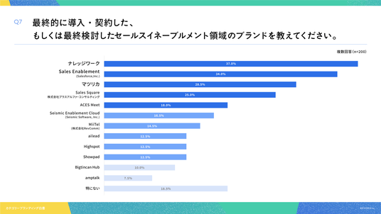 「Q7. 最終的に導入・契約した、もしくは最終検討したセールスイネーブルメント領域のブランドを教えてください。(複数回答)」(n=200)と質問したところ、ナレッジワーク が37.0%、Sales Enablementが34.0%、マツリカ が28.5%という回答となりました。
