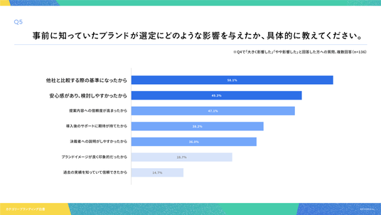 「Q5. Q4で「大きく影響した」「やや影響した」と回答した方にお聞きします。事前に知っていたブランドが選定にどのような影響を与えたか、具体的に教えてください。(複数回答)」(n=136)と質問したところ、「他社と比較する際の基準になったから」が58.1%、「安心感があり、検討しやすかったから」が49.3%、「提案内容への信頼度が高まったから」が47.1%という回答となりました。