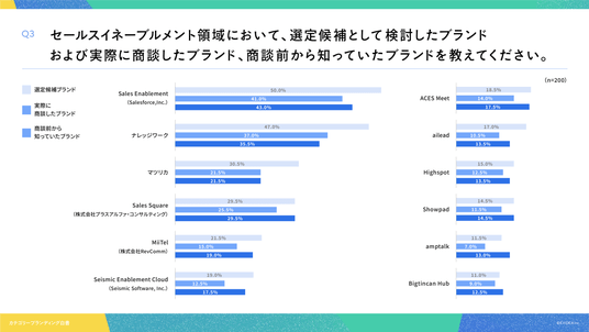 「Q3. セールスイネーブルメント領域において、選定候補として検討したブランドおよび実際に商談したブランド、商談前から知っていたブランドを教えてください。」(n=200)と質問したところ、選定候補ブランドは Sales Enablement(Salesforce,Inc.) が50.0%、実際に商談したブランドはSales Enablement(Salesforce,Inc.)が41.0%、商談前から知っていたブランドはSales Enablement(Salesforce,Inc.)が43.0%でそれぞれ首位に立つ結果となりました。