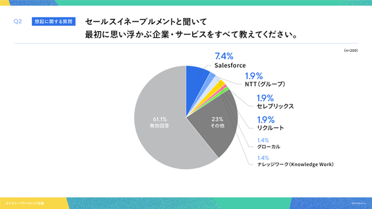「Q2. セールスイネーブルメントと聞いて最初に思い浮かぶ企業・サービスをすべて教えてください。(自由回答)」(n=200)と質問したところ、Salesforce が7.4%。NTT(グループ)、セレブリックス、リクルート が各1.9%という回答となりました。