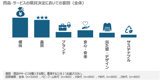 消費支出の配分を決める要因としては、「価格」と「品質」が上位を占めており、依然として合理的・機能的価値が重視されている。