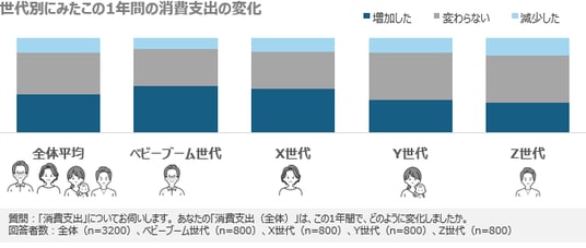 過去1年間の消費支出が増加傾向にあることがわかる。全体の増減を見ると、「増加した」が40.2%、「変わらない」が44.4%、「減少した」が15.4%という結果であった。減少よりも増加が大きく上回っており増加基調であるが、「変わらない」が最も多いことから、「維持から微増」が中心的な姿であると言える。