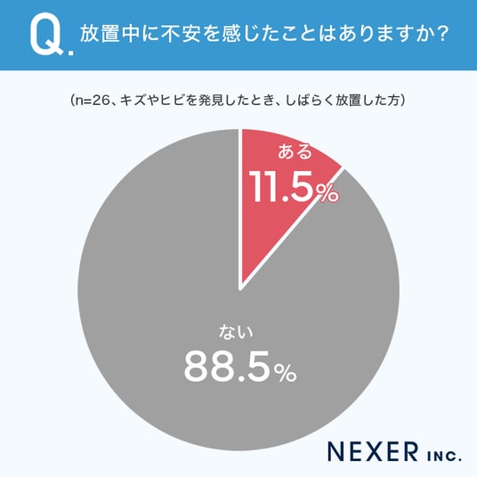 その結果「半年以上」が50.0%で最も多く、次いで「まだ放置している」が34.6%でした。合わせると84.6%が半年以上にわたってキズやヒビをそのままにしていることになります。