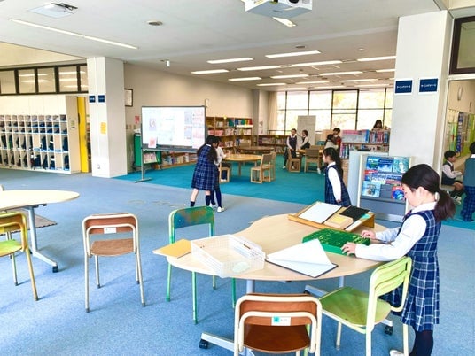 横浜市青葉区にある桐蔭学園小学校。校舎を歩いていくと、私たちが知っている「図書室」のイメージがガラリと変わります。教室を出ると、すぐそこは明るく開放的な「ラーニングスペース」。そのあちこちに本棚が置かれています。ここは、授業の合間に友だちとおしゃべりをしたり、クラブ発表の準備をしたりと、子どもたちが自由に使える場所。