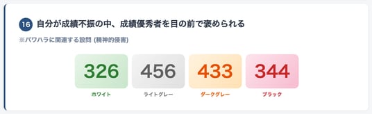 「自分が成績不振の中、成績優秀者を目の前で褒められる」という設問では、回答が4段階にほぼ均等に分散しました。▼ 設問16の回答分布