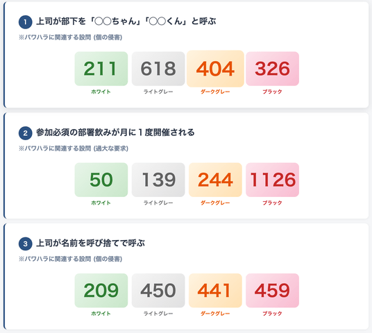 ホワイト(326名)からブラック(344名)まで、判定が大きく割れています。こうした「人によって感じ方がまったく違う」事例こそが、ハラスメントの本質的な難しさです。