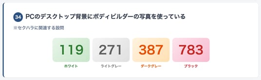「PCのデスクトップ背景にグラビアアイドルの水着写真を使っている」はブラック63%。一方、行為の構造が同じ「ボディビルダーの写真を使っている」はブラック50%。13ポイントの差が生じました。▼ 設問33:グラビアアイドルの水着写真