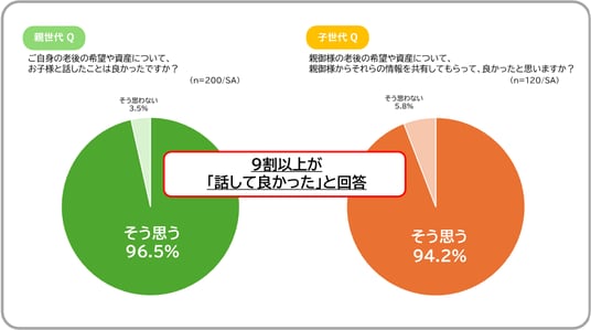 本調査では、老後の希望や資産について既に共有している親子の9割以上が「話して良かった(親世代:96.5%、子世代:94.2%)」と回答しており、情報の可視化が高い満足度を生んでいることが分かりました。その理由は、「絆が深まった」といった情緒的な側面以上に、「安心できた(親世代:62.2%、子世代:38.9%)」など、心理的安全性の向上を挙げる回答が多い結果となりました。
