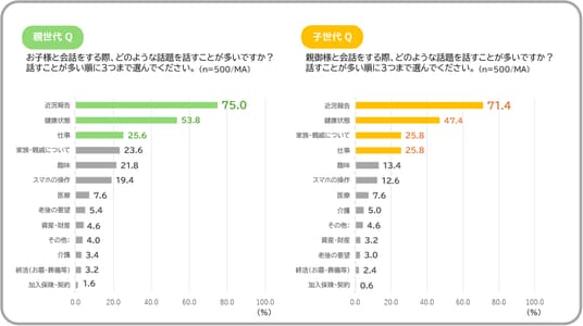 ・会話の話題は親子ともに「近況報告」や「健康状態」が中心(50%-70%程度)。「資産・財産」や「老後の要望」はわずか3~5%に留まっており、仲が良い親子でも将来の核心に触れない実態が見て取れる。