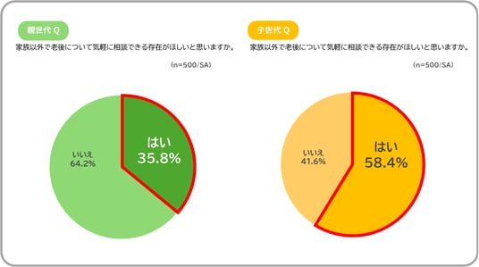 ・家族以外で老後について「気軽に相談できる存在がほしい」と感じている人は親世代で35.8% 、子世代では58.4%となった。親世代以上に、子世代の約6割が外部へのサポートを求めていることがわかった。