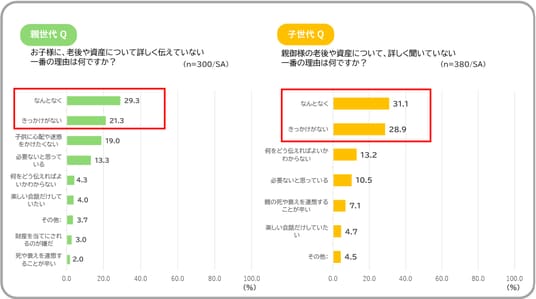 老後や資産について詳しく話していない理由を聞くと、親子ともに「なんとなく(親世代:29.3%、子世代:31.1%)」が最多となりました。次いで「きっかけがない(親世代:21.3%、子世代:28.9%)」、「子供に心配や迷惑をかけたくない(親世代:19.0%)」「何をどう伝えればよいかわからない(子世代:13.2%)」が上位を占めました。