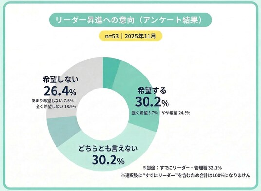 リーダー(主任・管理職)への昇進については、「希望する」が30.2%、「希望しない」が26.4%という結果でした。(「どちらとも言えない」30.2%、「すでにリーダー・管理職」32.1%)