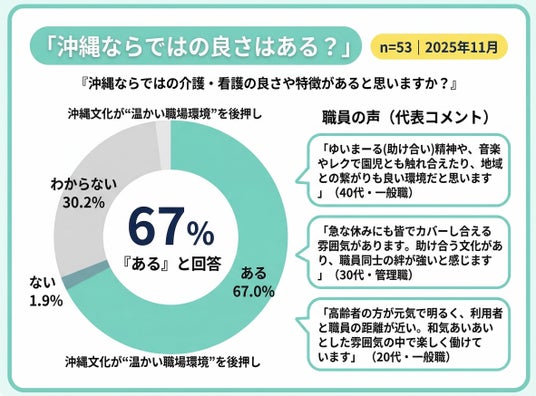67%の職員が沖縄ならではの良さを実感しており、この文化的土壌こそが、他地域では模倣しにくい独自性となっています。