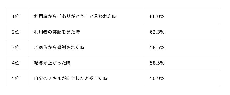 「発語ができない利用者様に、ありがとうと手を握って言ってもらえた事が、涙が出るほど嬉しかった」(50代・リーダー)