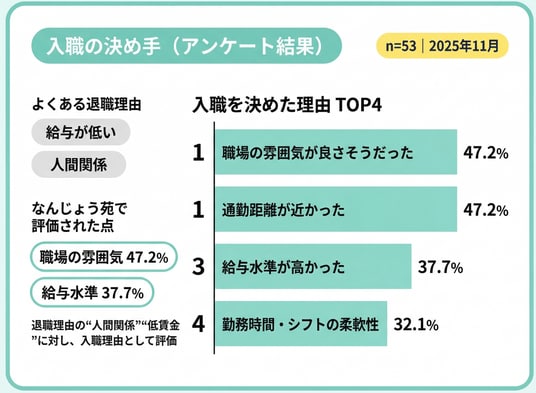 こうした状況のもと、なんじょう苑グループでは「給与水準の向上」「柔軟な勤務形態」などの待遇改善を継続的に実施してきました。しかし、どのような施策が職員の定着や満足度につながっているのか、現場の声をもとに検証したいという思いから、今回のアンケート調査を実施しました。