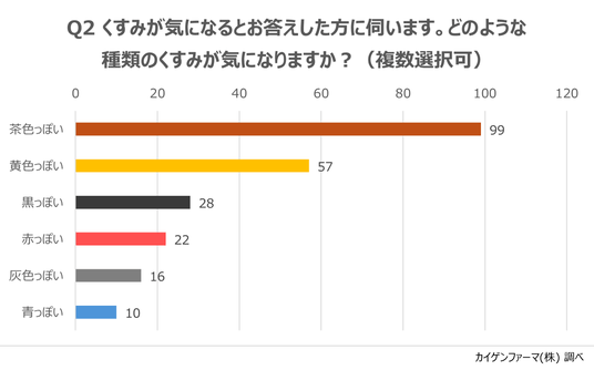 その結果、くすみが気になる方(46.0%)は、“茶ぐすみ”に次いで”黄ぐすみ”を気にされているようでした(“茶色っぽい” 53.8%、”黄色っぽい“ 31.0%)。