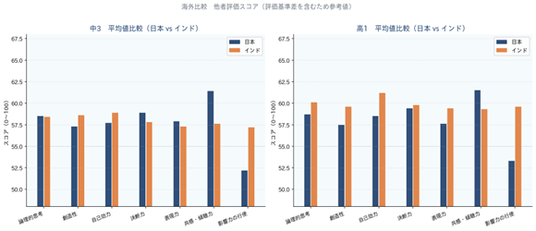 継続受検者が最も成長した項目は「影響力の行使」ですが、国際比較ではインドより5~7ポイント低く、日本が最も低い水準にある領域です。一方で学校間の差が存在し、環境設計によって変化し得ることがデータで示されています。発言・主導・リーダーシップの機会を意図的に組み込むことで、さらなる成長が期待できます。
