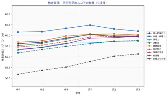 分析対象は、25コンピテンシーのうち自己評価・他者評価の双方で有効回答率が特に高い9項目(課題設定、創造性、論理的思考、個人的実行力、自己効力、決断力、表現力、共感・傾聴力、影響力の行使)に絞っています。信頼性の高いデータが揃う項目に集中することで、学校・学年間の比較や経年トレンドをより精度高く分析しています。