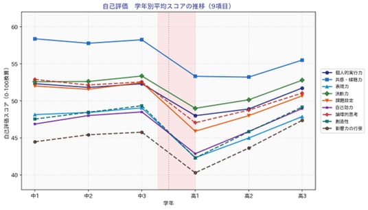 他者評価は中学1年から高校3年にかけて全9項目で緩やかに上昇しますが、自己評価では、高校入学時に広範な低下が観察されます。これは能力の低下ではなく、新しい参照集団のなかで自己認識が揺らぐことによるものと考えられます。この時期を放置すると萎縮や意欲低下につながるリスクがある一方、適切な支援設計により回復を早めることができます。高校入学直後は、非認知能力育成において介入効果が高い「タイミング」だといえます。