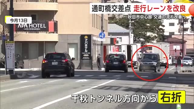 長年、走りづらさが課題となってきた秋田市中心部の変形十字路「通町橋交差点」で、交通の流れを改善するための大規模な改良が行われた。右折専用レーンの新設をはじめ、走行レーンや信号表示が変更されており、警察は通行の際、これまで以上に注意するよう呼びかけている。