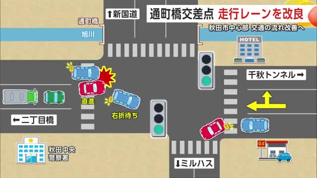 秋田市中心部にある通町橋交差点は、北側が千秋トンネル、南側が二丁目橋につながり、JR秋田駅に近いことから交通量が多い。