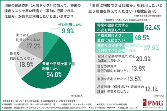 こうした課題を解決する糸口として、約6割が将来の疾病リスクを高い精度で「事前に把握できる仕組み」の利用に前向きであり、「不安の解消」だけでなく「今何をすべきか知りたい」という具体的な行動指針を求めていることがわかりました。
