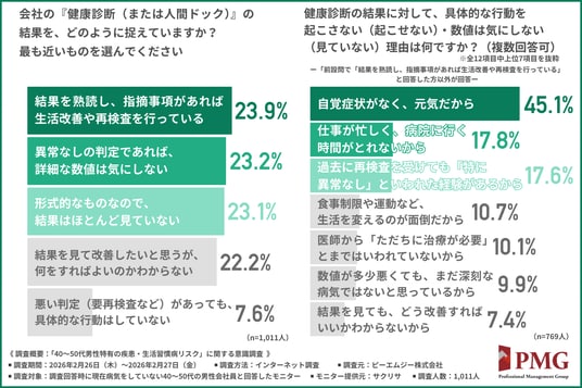 特に、健康状態の判断基準を「自覚症状の有無」に依存しており、健康診断で数値の異常を指摘されても、「元気だから」という理由で行動を起こさない方が多数を占めました。