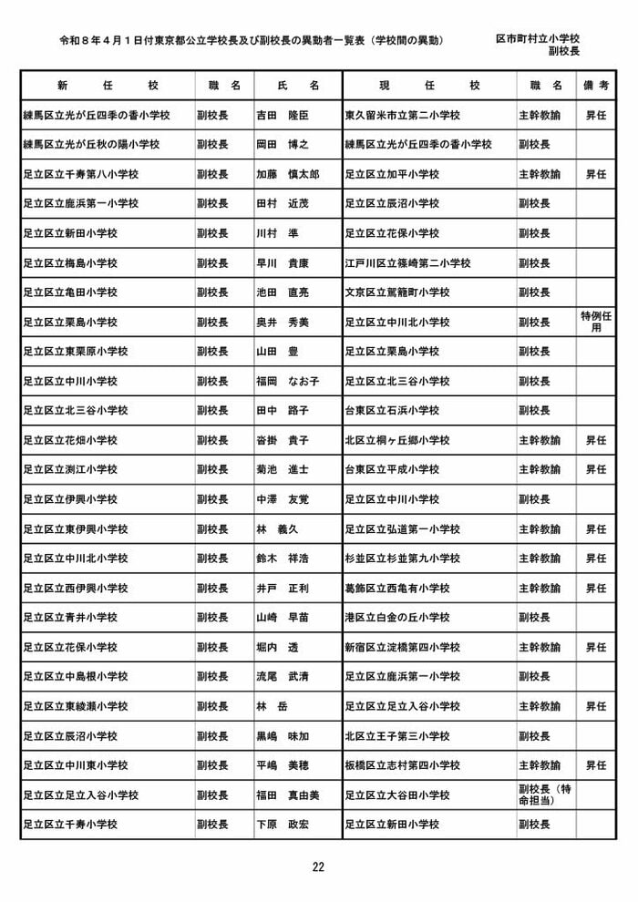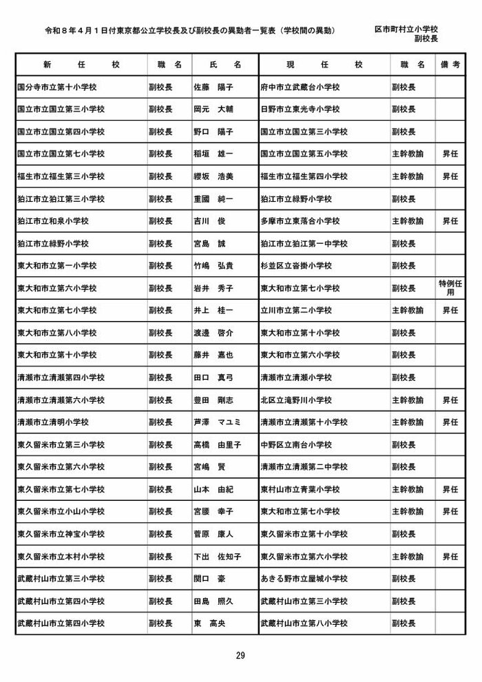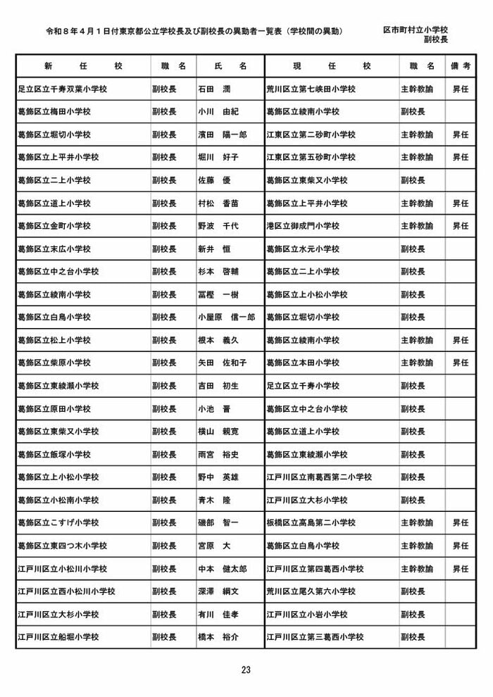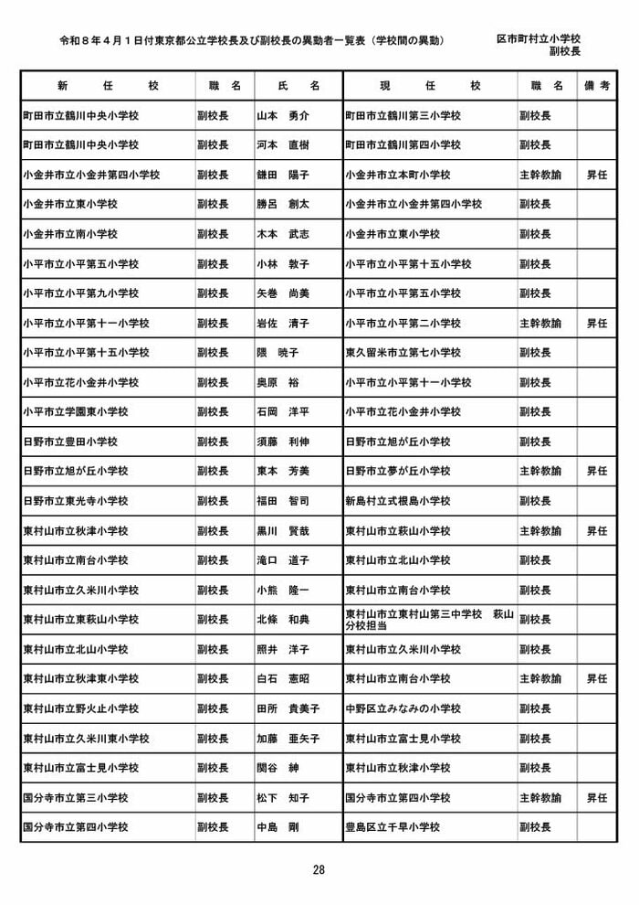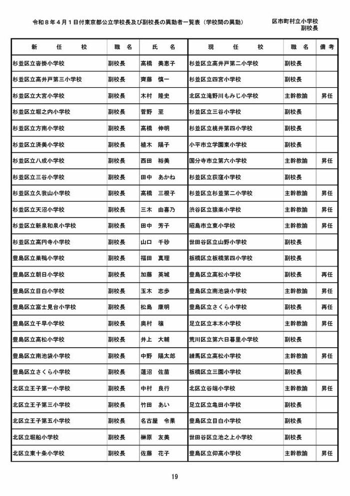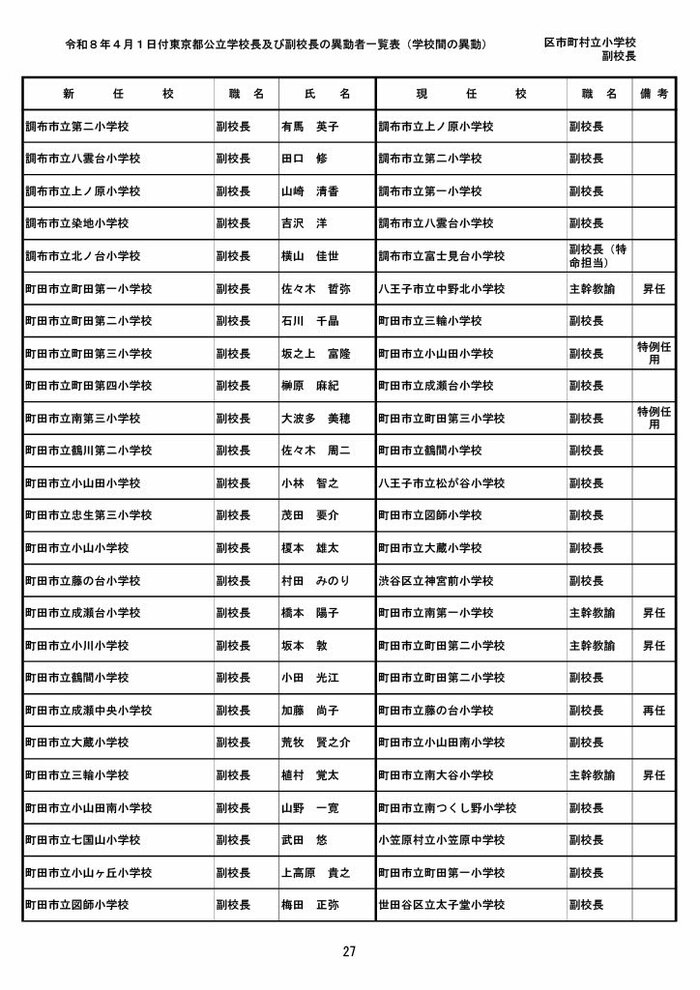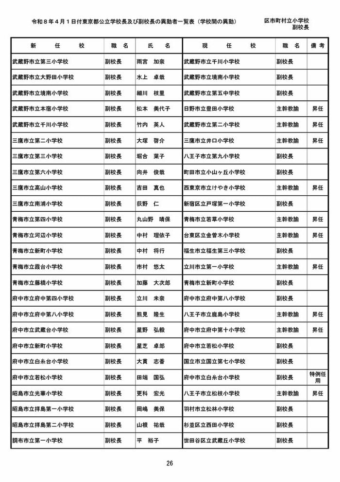 【全掲載】東京都公立小学校校長・副校長人事異動一覧 あなたの恩師はどの学校に? プライムオンライン編集部 2026年3月19日 木曜 午後5:35 東京都教育委員会は19日、東京都の区市町村立小学校の校長・副校長の人事異動を発表した。異動は4月1日付け。 区市町村立小学校の校長 東京都の区市町村立小学校校長の人事異動は以下の通り。 この記事の画像(31枚) 区市町村立小学校の副校長 東京都の区市町村立小学校副校長の人事異動は以下の通り。 プライムオンライン編集部 FNNプライムオンラインのオリジナル取材班が、ネットで話題になっている事象や気になる社会問題を独自の視点をまじえて取材しています。 1 2 最新全国ニュースの他の記事 住職「戦争やめてほしい」原油高騰で“火葬”の燃料が不足 日本人にも人気の“ピンクの巨大像”寺院が危機 タイ 国際 2026年3月19日 8つの小・中学校で280人以上が下痢や嘔吐 児童・生徒や教職員 命に関わる症状なし 大阪・熊取町 社会 2026年3月19日 仮設トイレ壁面をガスバーナーであぶり燃え広がったか 仮設トイレ数百基と住宅3棟が全焼 山形・大江町 社会 2026年3月19日 中国外務省「台湾問題は内政で干渉許さない」 高市首相の国会答弁「国際社会が悪質性を明確に認識」と主張 アメリカ情報機関の年次報告 国際 2026年3月19日 一覧ページへ