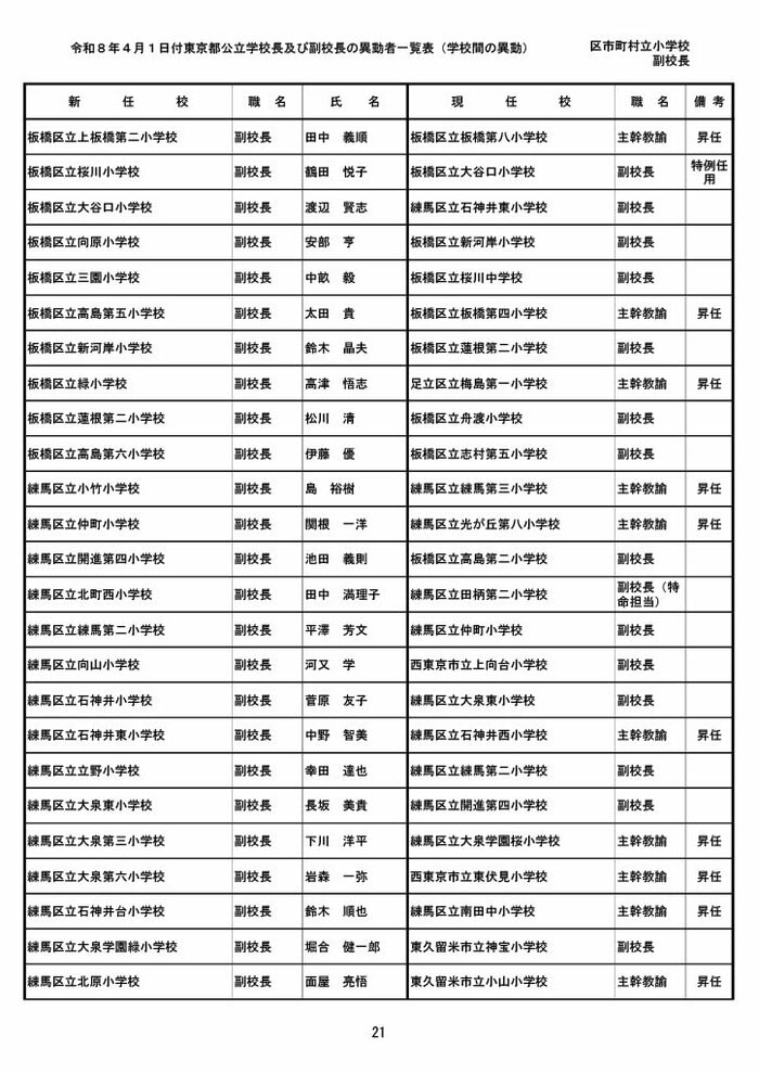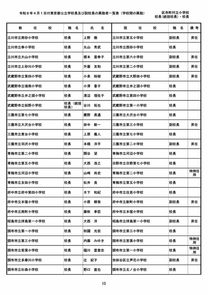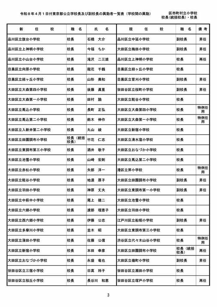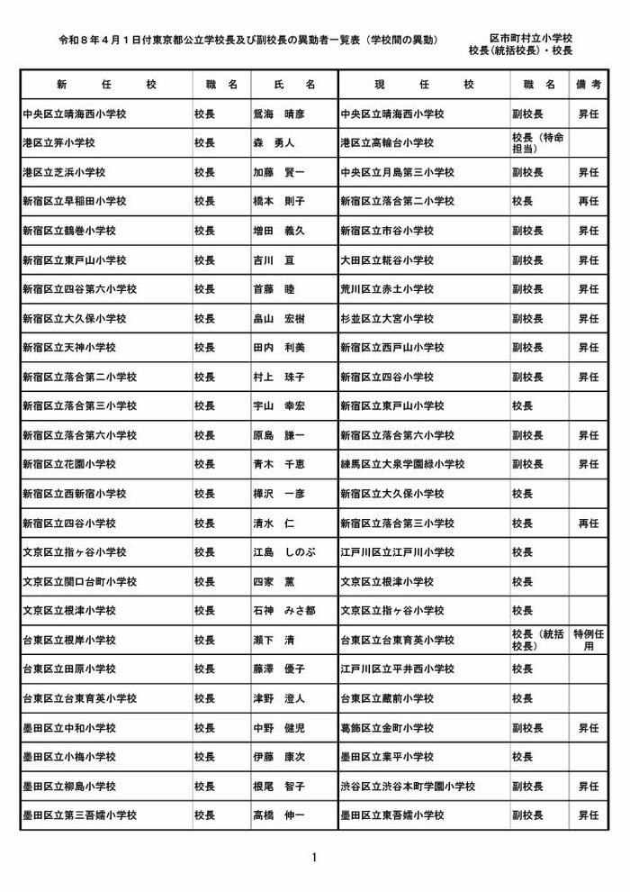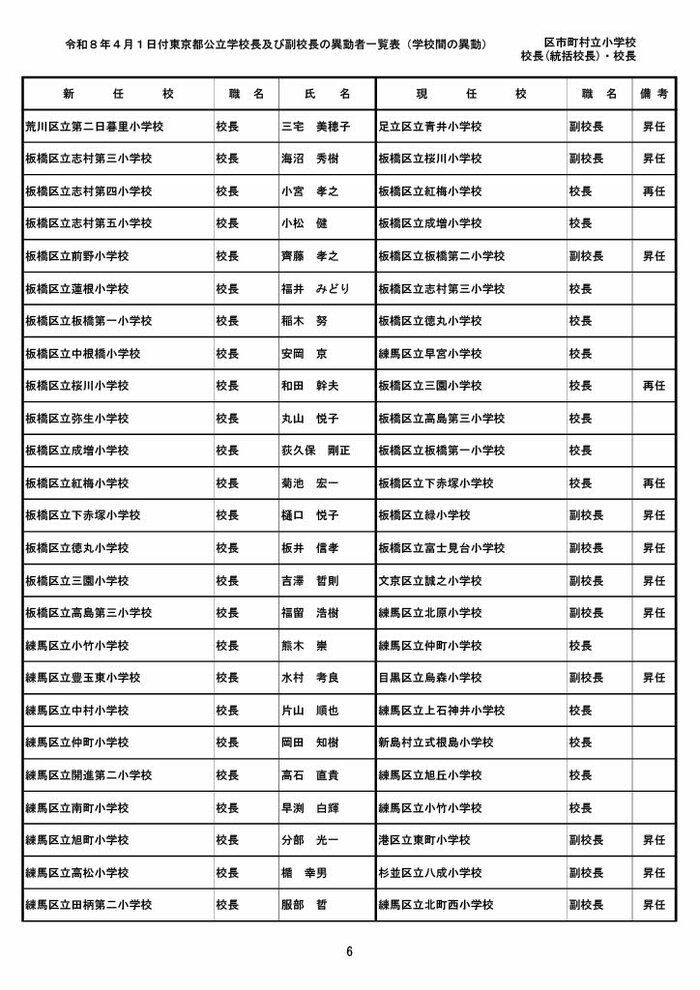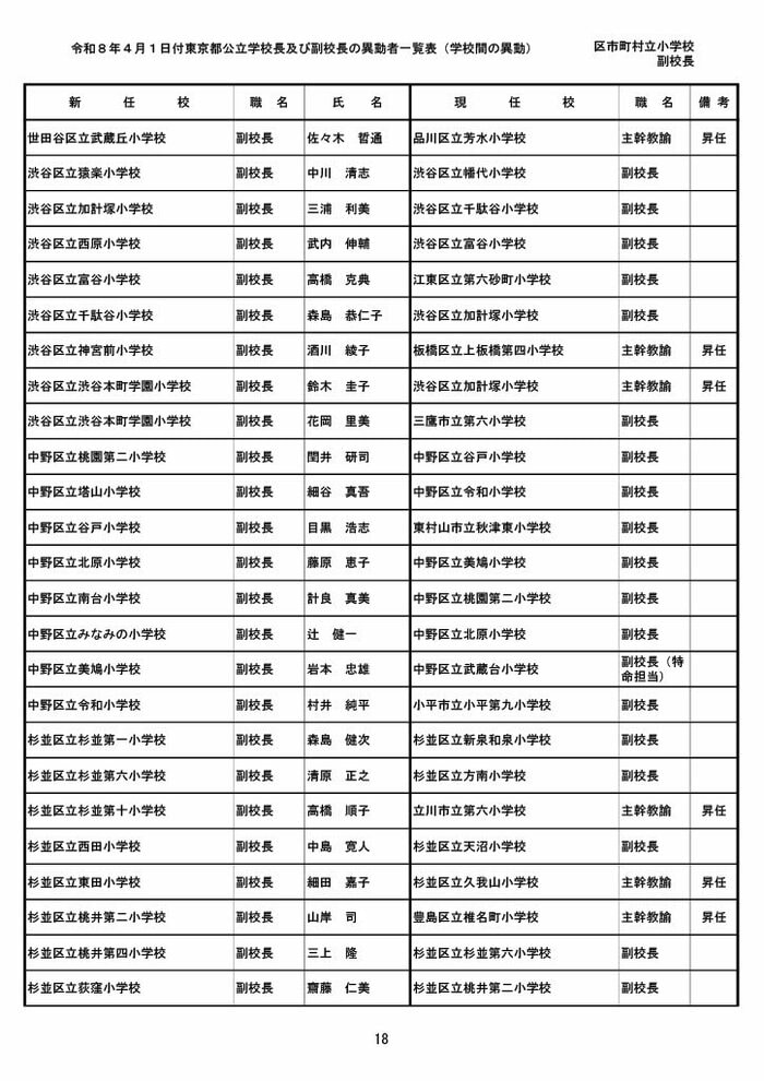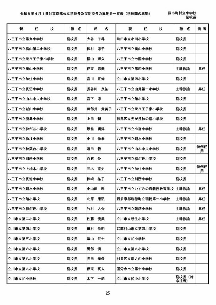 【全掲載】東京都公立小学校校長・副校長人事異動一覧 あなたの恩師はどの学校に? プライムオンライン編集部 2026年3月19日 木曜 午後5:35 東京都教育委員会は19日、東京都の区市町村立小学校の校長・副校長の人事異動を発表した。異動は4月1日付け。 区市町村立小学校の校長 東京都の区市町村立小学校校長の人事異動は以下の通り。 この記事の画像(31枚) 区市町村立小学校の副校長 東京都の区市町村立小学校副校長の人事異動は以下の通り。 プライムオンライン編集部 FNNプライムオンラインのオリジナル取材班が、ネットで話題になっている事象や気になる社会問題を独自の視点をまじえて取材しています。 1 2 最新全国ニュースの他の記事 住職「戦争やめてほしい」原油高騰で“火葬”の燃料が不足 日本人にも人気の“ピンクの巨大像”寺院が危機 タイ 国際 2026年3月19日 8つの小・中学校で280人以上が下痢や嘔吐 児童・生徒や教職員 命に関わる症状なし 大阪・熊取町 社会 2026年3月19日 仮設トイレ壁面をガスバーナーであぶり燃え広がったか 仮設トイレ数百基と住宅3棟が全焼 山形・大江町 社会 2026年3月19日 中国外務省「台湾問題は内政で干渉許さない」 高市首相の国会答弁「国際社会が悪質性を明確に認識」と主張 アメリカ情報機関の年次報告 国際 2026年3月19日 一覧ページへ
