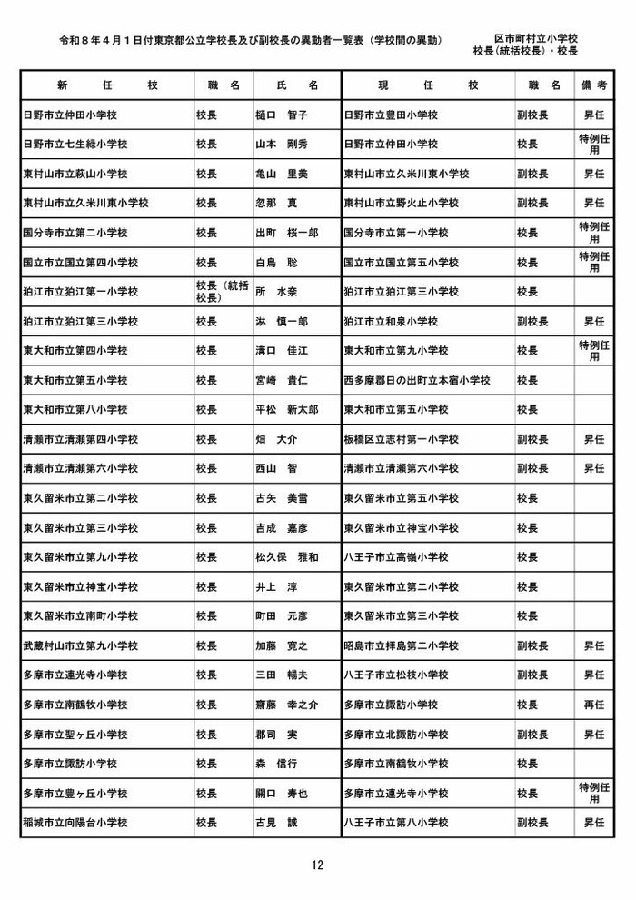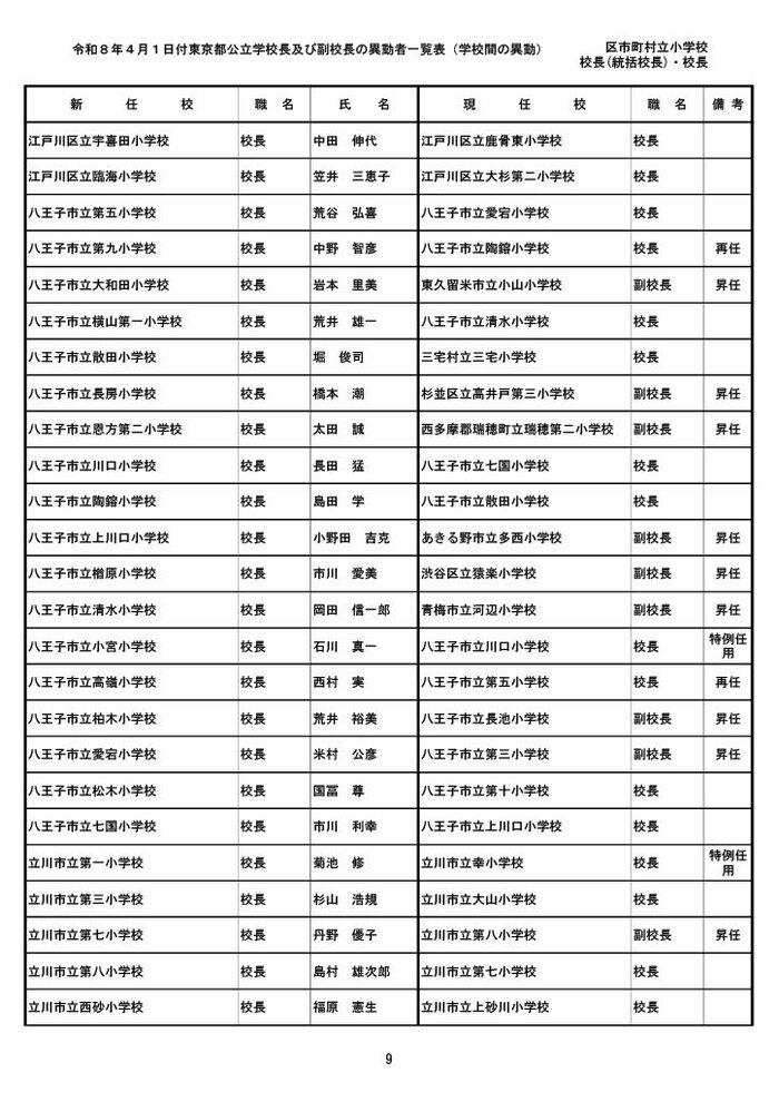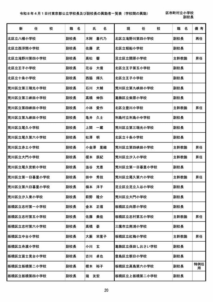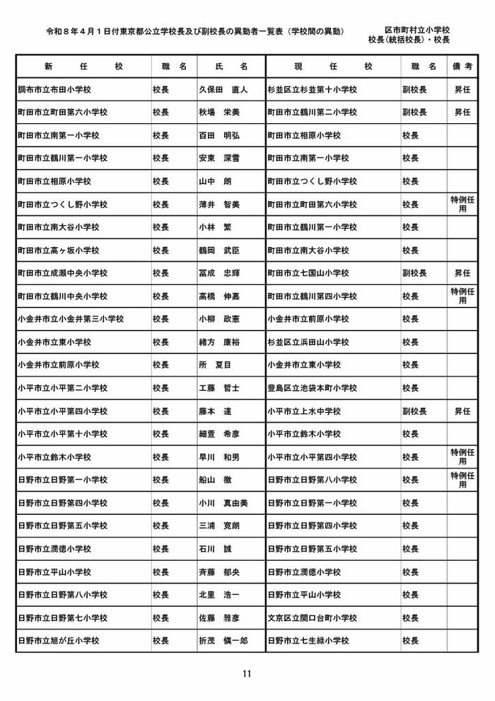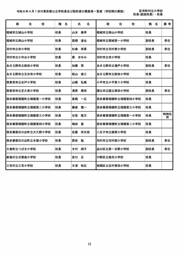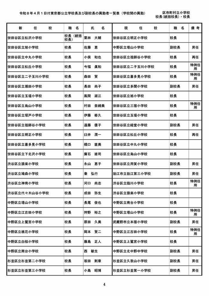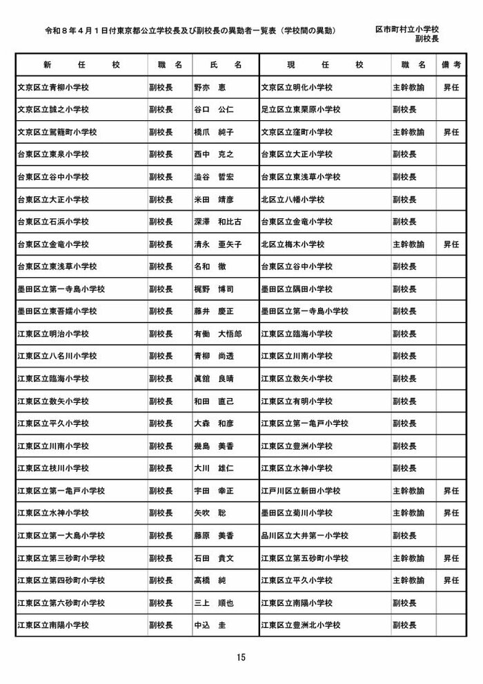 【全掲載】東京都公立小学校校長・副校長人事異動一覧 あなたの恩師はどの学校に? プライムオンライン編集部 2026年3月19日 木曜 午後5:35 東京都教育委員会は19日、東京都の区市町村立小学校の校長・副校長の人事異動を発表した。異動は4月1日付け。 区市町村立小学校の校長 東京都の区市町村立小学校校長の人事異動は以下の通り。 この記事の画像(31枚) 区市町村立小学校の副校長 東京都の区市町村立小学校副校長の人事異動は以下の通り。 プライムオンライン編集部 FNNプライムオンラインのオリジナル取材班が、ネットで話題になっている事象や気になる社会問題を独自の視点をまじえて取材しています。 1 2 最新全国ニュースの他の記事 住職「戦争やめてほしい」原油高騰で“火葬”の燃料が不足 日本人にも人気の“ピンクの巨大像”寺院が危機 タイ 国際 2026年3月19日 8つの小・中学校で280人以上が下痢や嘔吐 児童・生徒や教職員 命に関わる症状なし 大阪・熊取町 社会 2026年3月19日 仮設トイレ壁面をガスバーナーであぶり燃え広がったか 仮設トイレ数百基と住宅3棟が全焼 山形・大江町 社会 2026年3月19日 中国外務省「台湾問題は内政で干渉許さない」 高市首相の国会答弁「国際社会が悪質性を明確に認識」と主張 アメリカ情報機関の年次報告 国際 2026年3月19日 一覧ページへ