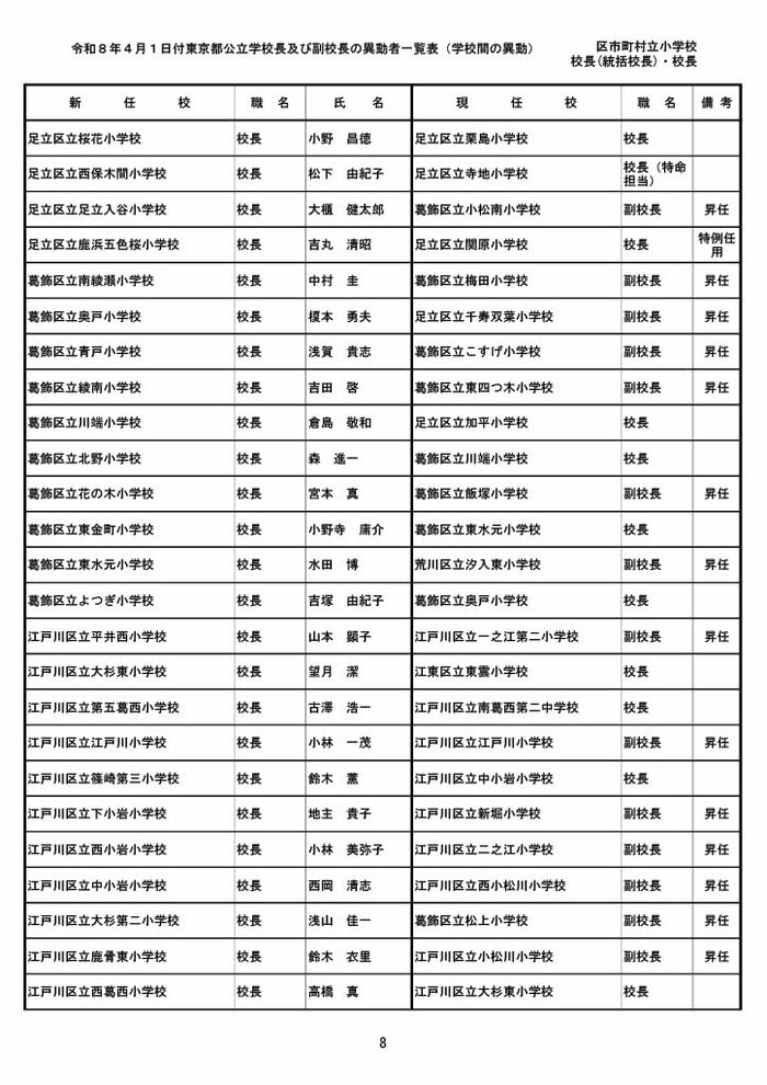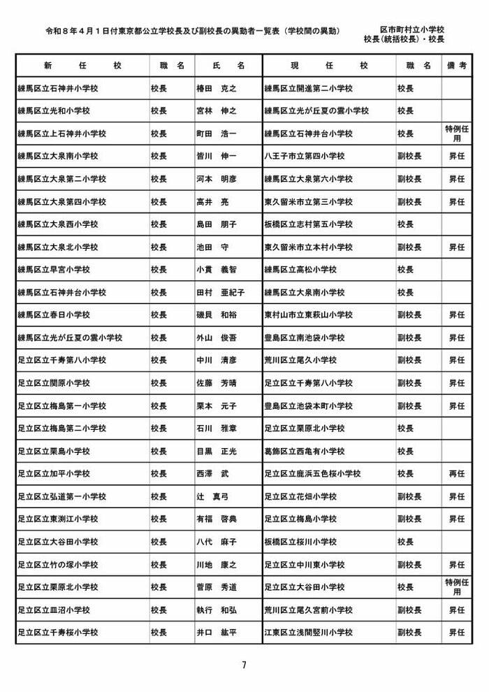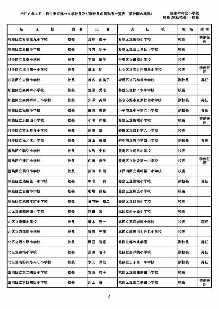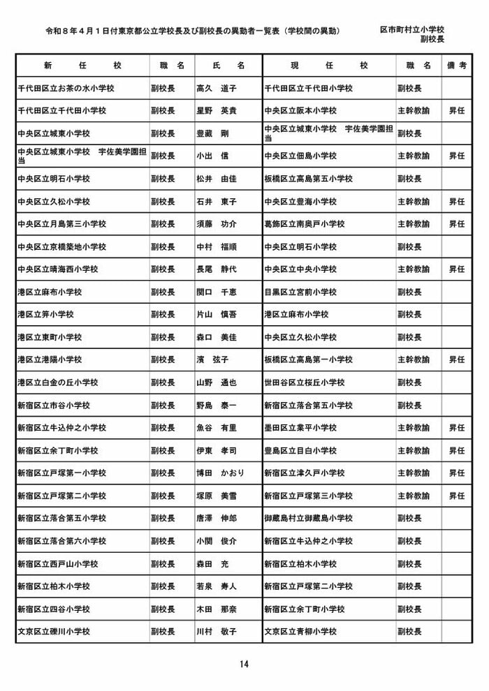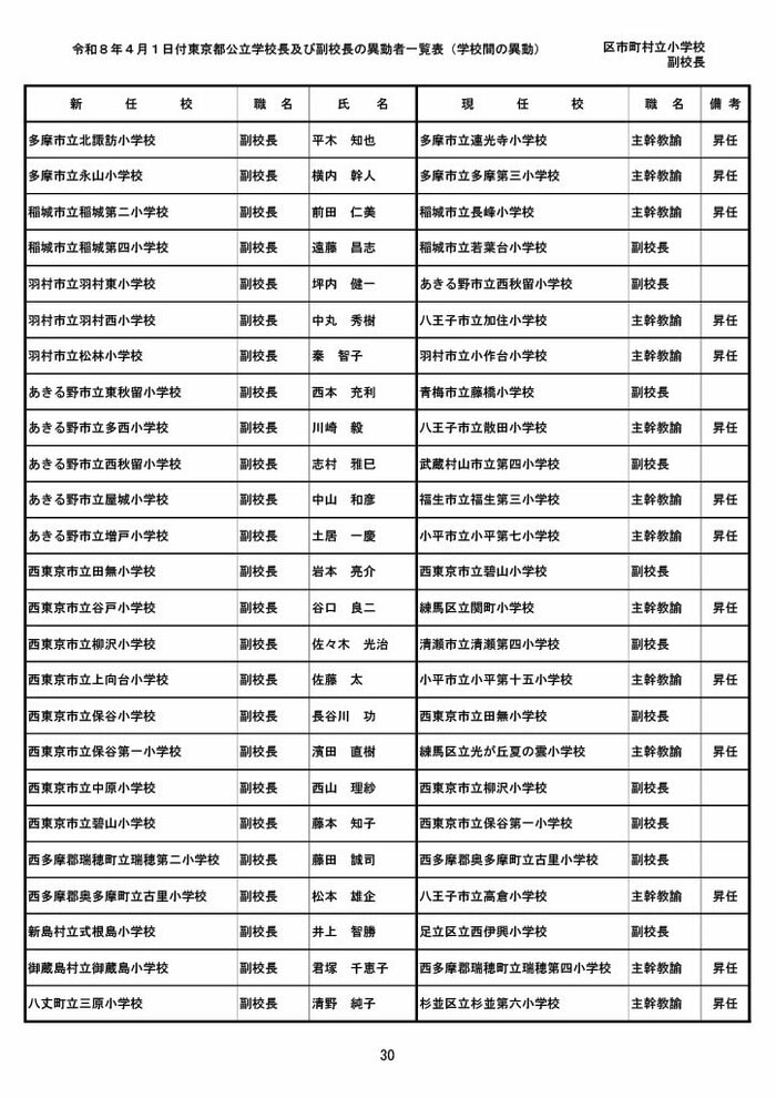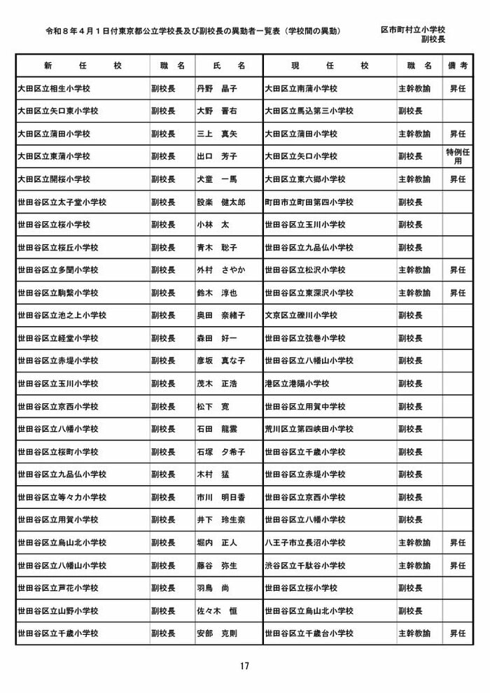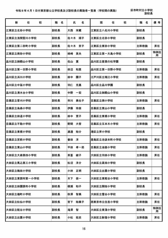 【全掲載】東京都公立小学校校長・副校長人事異動一覧 あなたの恩師はどの学校に? プライムオンライン編集部 2026年3月19日 木曜 午後5:35 東京都教育委員会は19日、東京都の区市町村立小学校の校長・副校長の人事異動を発表した。異動は4月1日付け。 区市町村立小学校の校長 東京都の区市町村立小学校校長の人事異動は以下の通り。 この記事の画像(31枚) 区市町村立小学校の副校長 東京都の区市町村立小学校副校長の人事異動は以下の通り。 プライムオンライン編集部 FNNプライムオンラインのオリジナル取材班が、ネットで話題になっている事象や気になる社会問題を独自の視点をまじえて取材しています。 1 2 最新全国ニュースの他の記事 住職「戦争やめてほしい」原油高騰で“火葬”の燃料が不足 日本人にも人気の“ピンクの巨大像”寺院が危機 タイ 国際 2026年3月19日 8つの小・中学校で280人以上が下痢や嘔吐 児童・生徒や教職員 命に関わる症状なし 大阪・熊取町 社会 2026年3月19日 仮設トイレ壁面をガスバーナーであぶり燃え広がったか 仮設トイレ数百基と住宅3棟が全焼 山形・大江町 社会 2026年3月19日 中国外務省「台湾問題は内政で干渉許さない」 高市首相の国会答弁「国際社会が悪質性を明確に認識」と主張 アメリカ情報機関の年次報告 国際 2026年3月19日 一覧ページへ