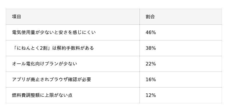 - 注意点として、46%の人が「電気の使用量が少ないと安さを感じにくい」と回答。「にねんとく2割」の解約手数料についても事前に理解しておく必要がある(38%)という声もあった。