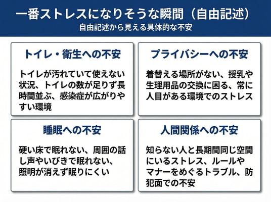 また、人間関係や防犯への不安、ペット同伴の難しさなども散見され、避難所でのストレスは物資不足だけでなく、環境・ルール・同居ストレスに強く左右されることが示唆されます。