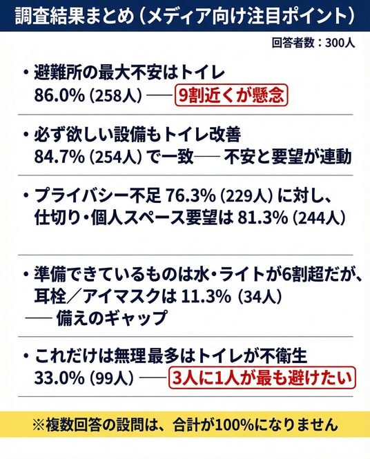 災害時対策300人調査:避難所の最大不安はトイレ86.0%(258人)――必ず欲しい設備もトイレ改善84.7%(254人)で一致。備蓄は水・ライトが6割超も、耳栓・アイマスクは11.3%(34人)