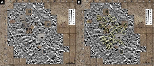 図4 ハルベトスワン・テペシ遺跡の地中磁気探査の結果。(A)磁気異常図。(B)Aと同じ図に注釈を書き加えた図。白い点線は遺跡の外周を示す。黄色い実線は過去の発掘調査で発掘された石壁の位置を表す。黄色い破線は本研究の地中磁気探査によって検出された石壁の位置を表す。遺跡の中央付近に長方形の構造が密集して分布していることが明らかとなった。