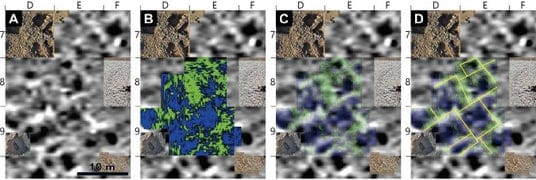 図5 ハルベトスワン・テペシ遺跡の地中磁気探査および地中レーダー探査の結果(拡大図)。(A)磁気異常図。(B)磁気異常図にレーダー反射強度図を重ねたもの。緑色で示された部分が地中の石壁に由来する強い反射を表す。(C)磁気異常図にレーダー反射強度図を半透明で重ね、両者を比較した図。(D)Cと同じ図に、検出された石壁の位置を黄色い実線で示した図。