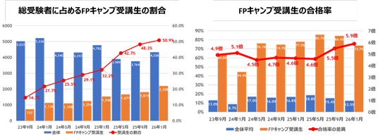 2026年1月のFP1級学科試験において、総受検者4,338名のうちFPキャンプ受講生が占める割合は50.9%※1となり、初めて全体の5割を上回りました。FPキャンプが開講した2023年7月以降、受検者に占める受講生の割合は8回連続で右肩上がりの成長を続けています。また、今回のFPキャンプ受講生の合格率は73.7%※2と、全体の合格率12.5%の約5.9倍を記録。2023年7月以降の試験において、8回連続で全体合格率の4.5倍を超える高い合格率を達成しています。