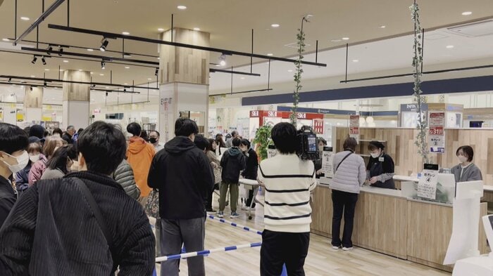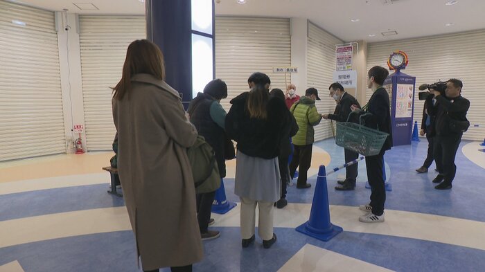 「開店30分前です。当初はこの時間から整理券が配布される予定でしたが、商品券を求める客が殺到したことから急きょ1時間前倒しして整理券が配布されています絶え間なく列ができています」