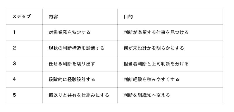 判断は知識教育だけでは身につきにくく、経験、振返り、修正を通じて形成されます。「判断できる人材」を育てる前に必要な「組織の判断構造設計プログラム」でも、経験設計と振返り設計が主要要素として示されています。そのため、難しい判断を最初から丸ごと任せるのではなく、難度の低い判断から順に積ませる段階設計が必要です。