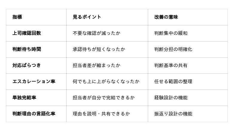 何でも上司判断に上がる状態から、担当者が一定範囲で完結できる状態へ移れるかを見る指標です。判断分担の設計が機能しているかを確認できます。「判断できる人材」を育てる前に必要な「組織の判断構造設計プログラム」の考え方と整合します。