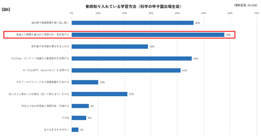 平日の平均学習時間は、科学の甲子園出場生徒は「2時間~3時間未満(28%)」が最多だったのに対し、一般高校生は「0~30分未満(31%)」が最も多い結果となりました【図4】。また、休日も科学の甲子園出場生徒は85%が2時間以上学習していると回答し、中には10時間以上学習に取り組む生徒も見られましたが、一般高校生は2時間未満が65%を占めるなど、普段の学習時間に大きな差がありました【図5】。科学の甲子園出場生徒に普段取り入れている学習方法について尋ねたところ、半数以上が「間違えた問題を重点的に原因分析・再学習する(58%)」と回答しました。先述の「AIを活用する」だけでなく、「過去問や模擬問題を繰り返し解く」「YouTubeなどの動画教材を活用する」「要点をまとめる」「友人との勉強会」なども多く、従来の基本的な方法から現代ならではのデジタルを活用する手法まで、自身の学習スタイルにあわせて、様々な方法を柔軟に組み合わせている様子がうかがえました【図6】。